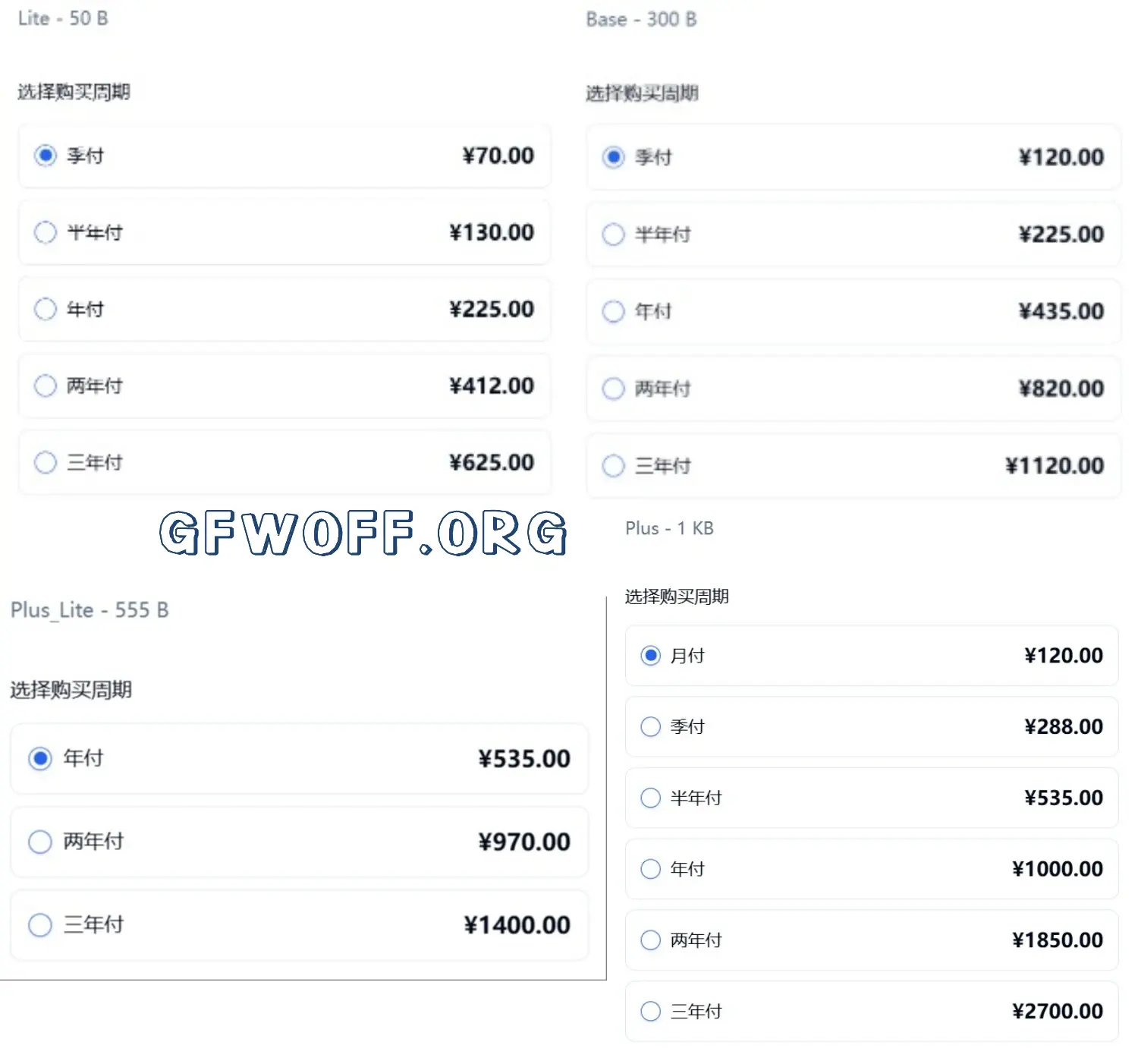 - Lite:¥70/季度,50G 流量/月。